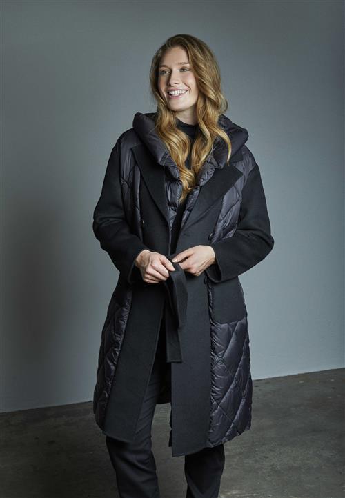 Lekker kåpe med hette. Tøff kombinasjon av boblestoff og ull. 51% ull. 45%polyester. 2% Polyamid. 2% acryl. Innerstoff 100 % Polyester.
