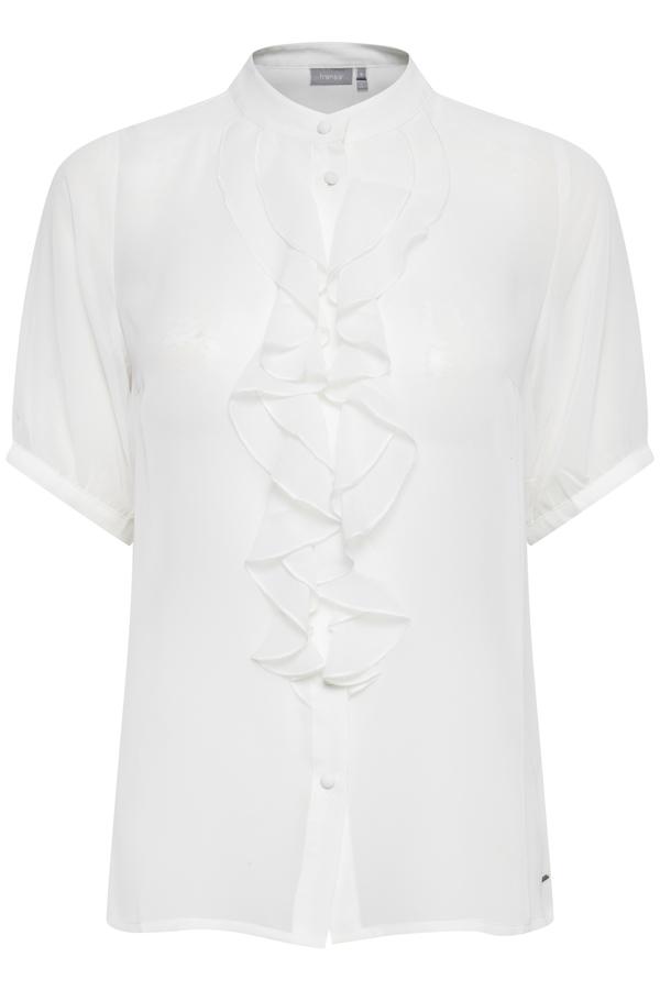 Hvit bluse med kort arm. Rysje effekt forand, trekte knapper foran og på armene.