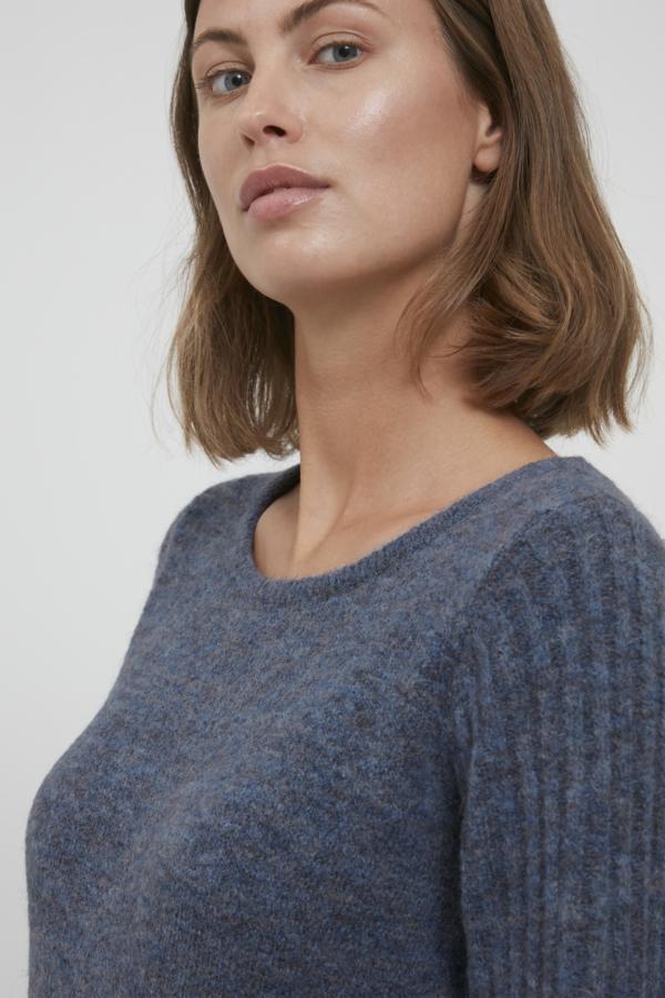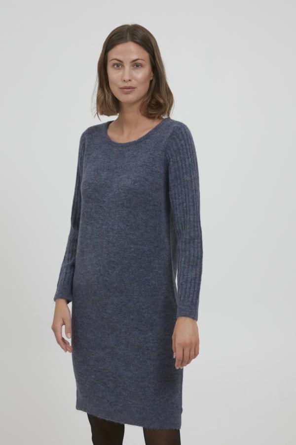 Strikket kjole fra Fransa. Rett over kneet lengde. Blåmelert. 43% nylon 38% akryl 10% ull 6% alpakka 3% elastan