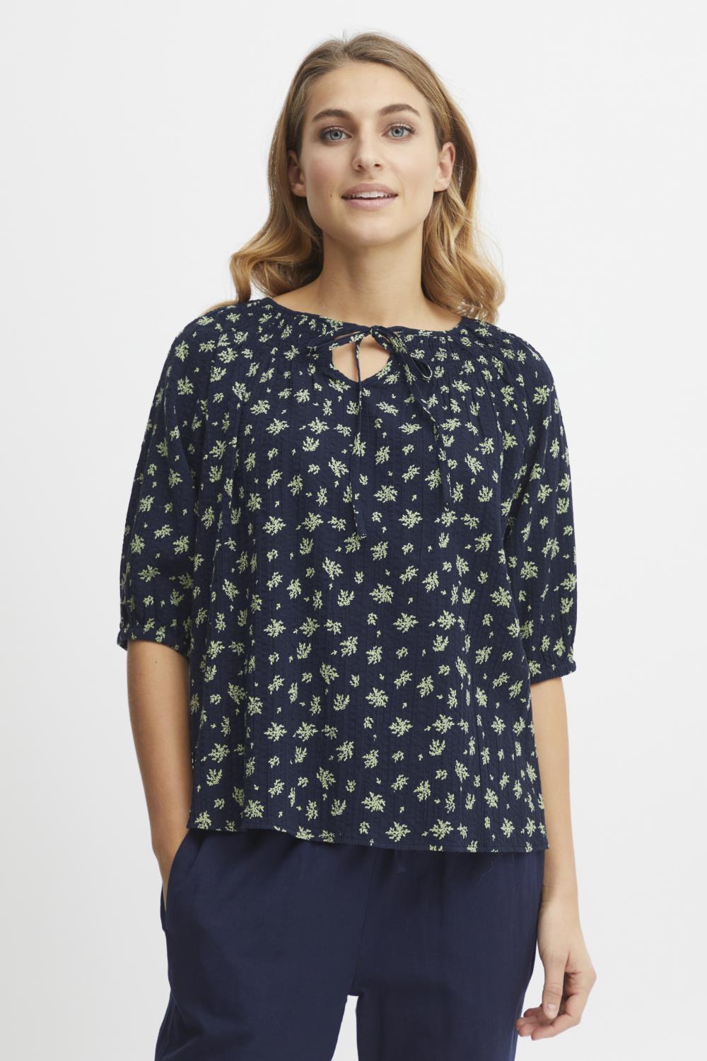 Bluse med kort arm, snøring i halsen.