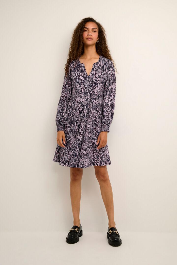 Fin kjole i 100 % Viskose. Lett utskrådd modell med puffarm. Strikkavsluttning mederst på armen.