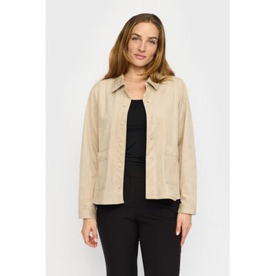 Anvennlig jakke i semsket skinn- look. Trykknapp-lukking. To lommer