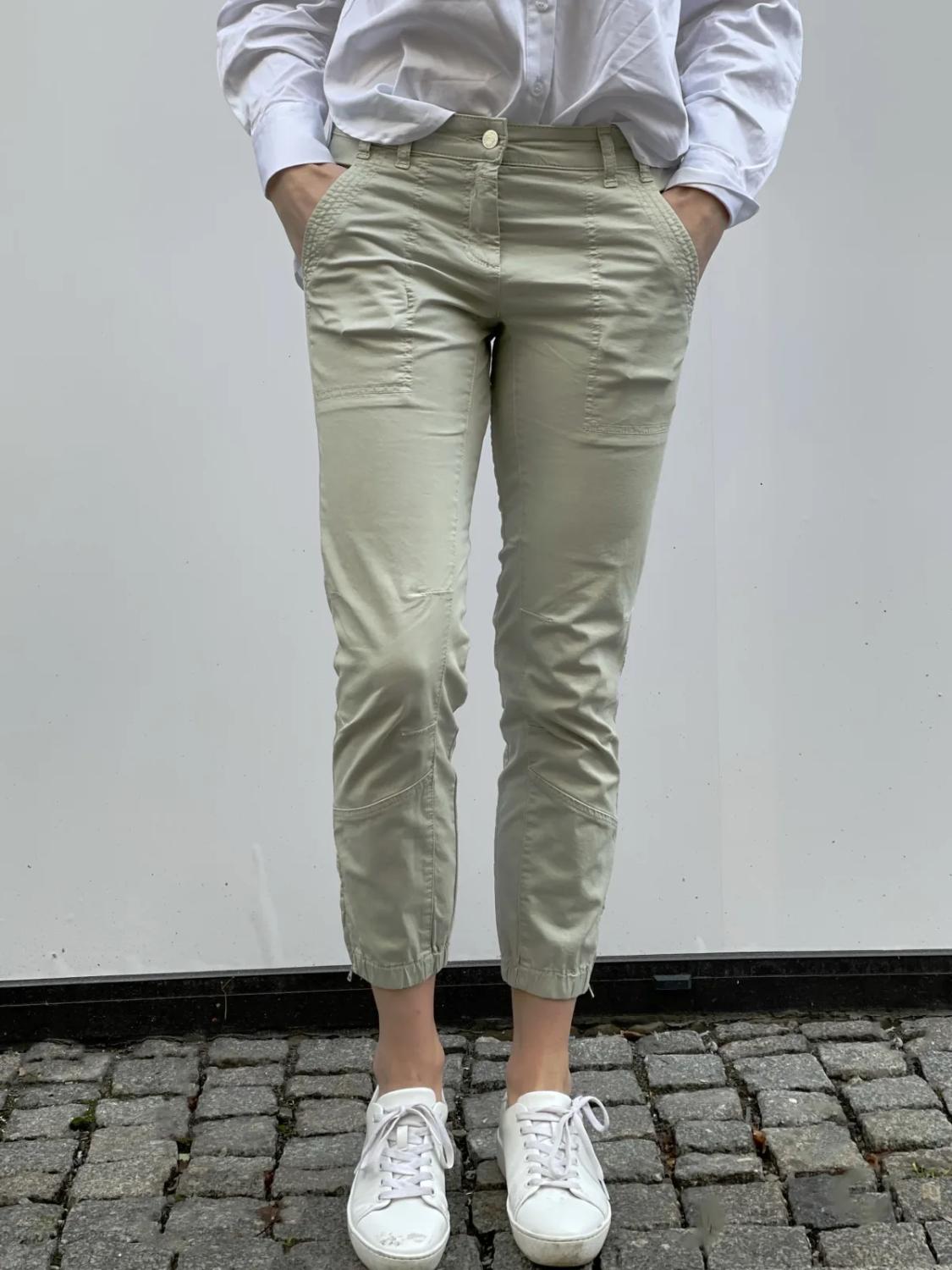 Tøff bukse fra Cambio. med glidelås og strikk nederst i beina. Stikklommer og sømmer foran. 97% bomull 3% elastane