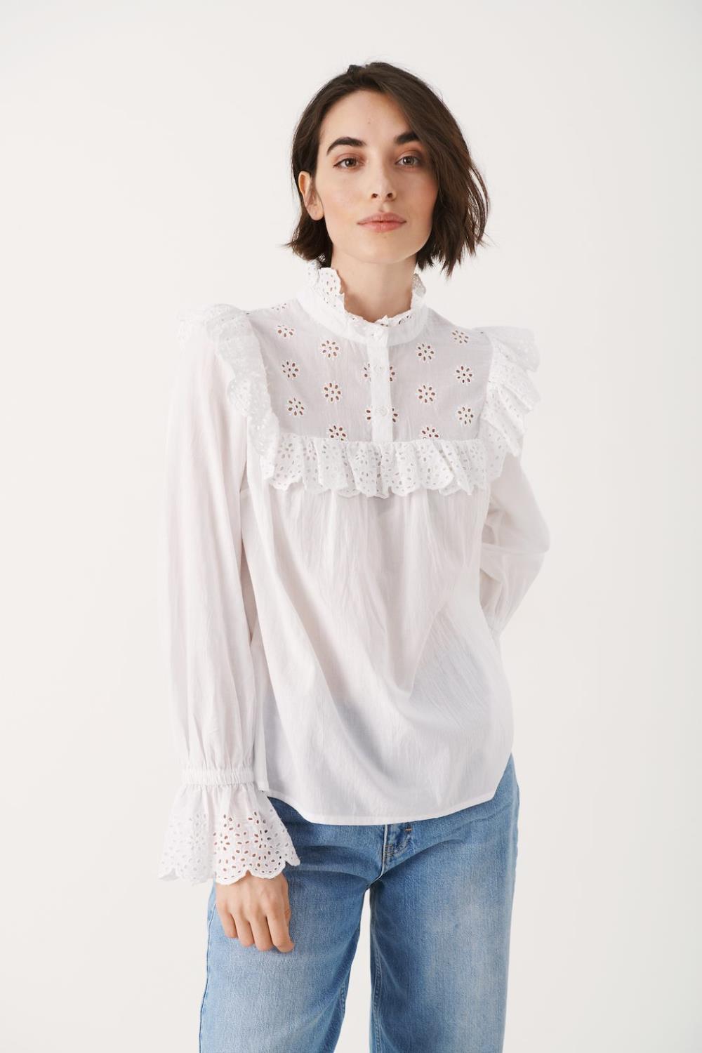 Lekker hvit bluse med blondedetaljer på brystet og nederst på armene. 100% bomull
