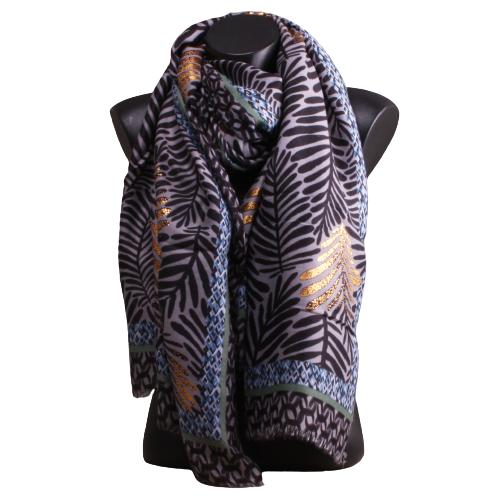Lekkert møsntret skjerf med grått, sort, litt blått og grønt.