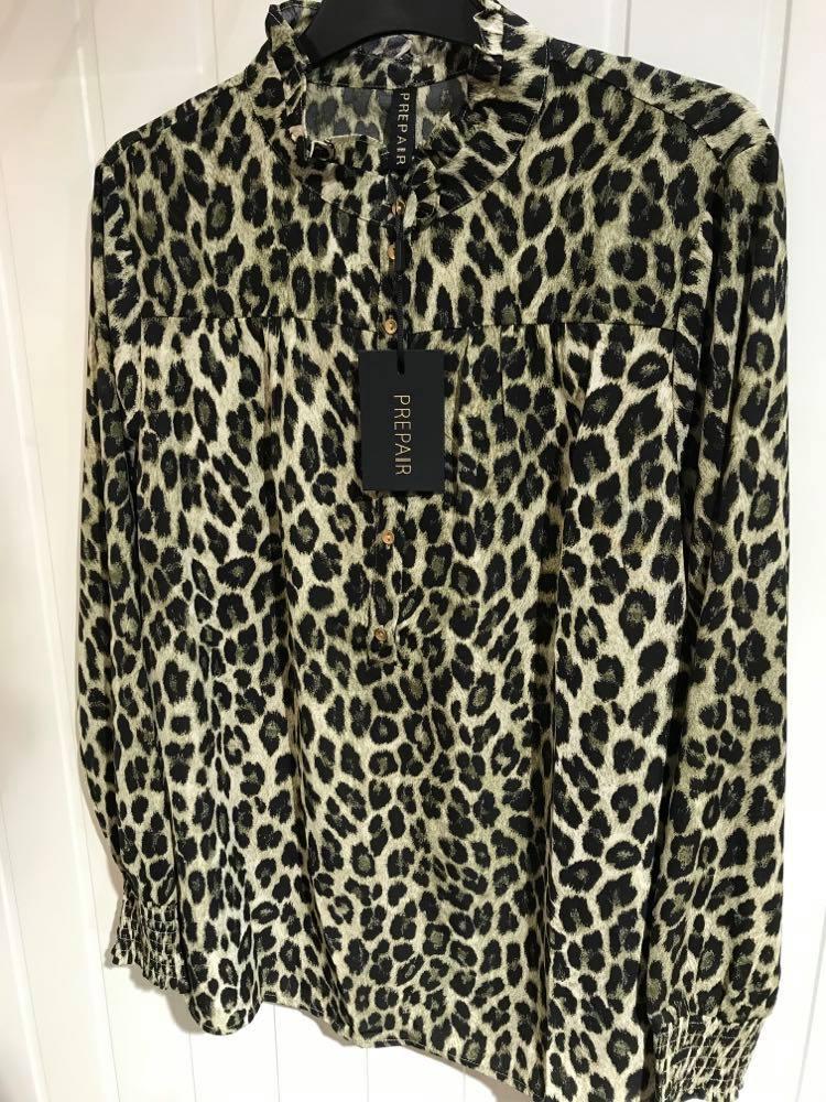 Tøff leopard bluse, i grønn farge. Strikk effekt nederst på armene, knapper halvveis ned foran. 1005 polyester